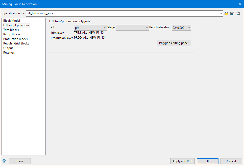 The regular grid blocks are cut out from the benches using vertical planes, positioned at the target mining blocks dimensions. The regular grid polygons can optionally be created as well. The blocks and the polygons are created inside each bench production zone polygon, generated by the MBG Setup. In the absence of production zone polygons, and on user request, the mining blocks and polygons may be created using the full bench outline in place of the production zone. The polygons are saved in the design database, and the blocks are saved as triangulations, under the file hierarchy specified during setup.