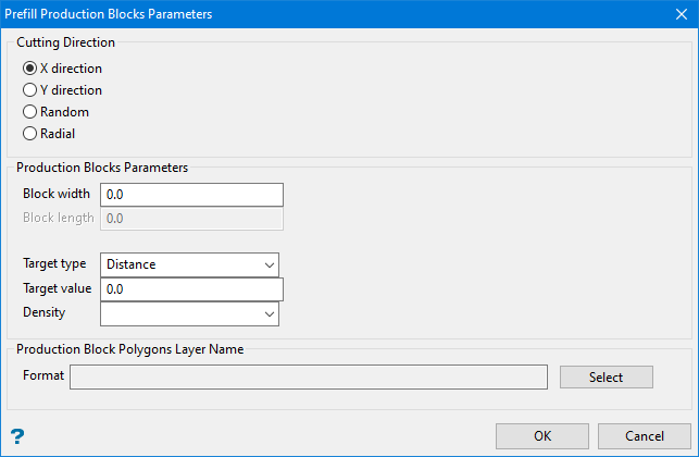 The Mining Blocks Generation can create trim polygons automatically, use existing polygons that you have already created, or not create them at all. When the checkbox in the Create Automatically column is selected, the Mining Blocks Generation will create the polygons automatically matching the specified Cutting Direction, Target Type and Target Value. If the target type is tonnage, then a Density value must entered.
