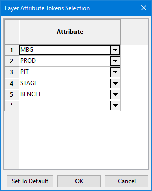 The trim polygons and blocks naming is flexible, including an optional staring index, the name of the pit, stage, bench, the block type, block identifier, and any prefix, suffix or text that the user enters at the Attributes Tokens subpanel, which opens on clicking the Select button.