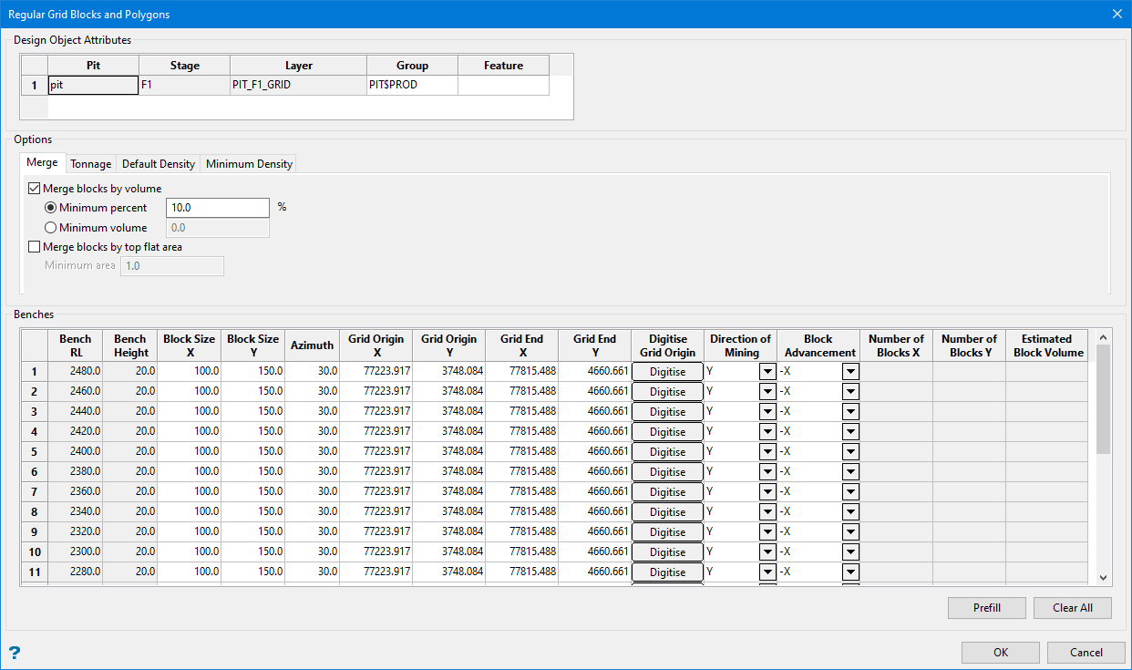 A grid can be defined for each bench, but the whole Benches table can be also prefilled using the Prefill button.