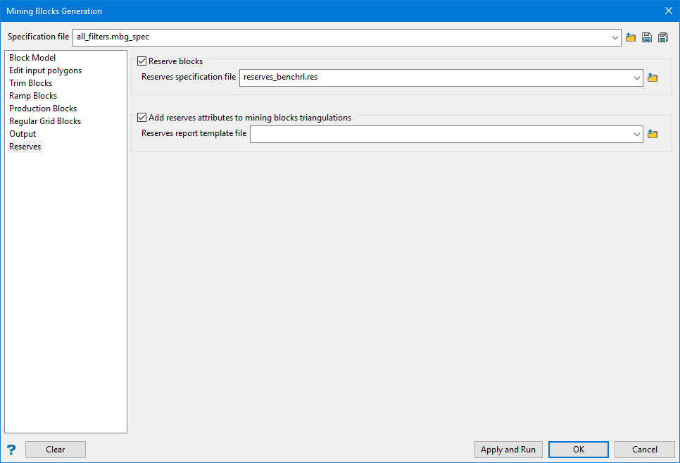 After the mining blocks are generated, the reserves can also be calculated. A reserve specification file is required. The specification files will be modified automatically and the names of all block triangulation files populated. The Advanced Reserves option is invoked and the results saved into a reserves style report file.