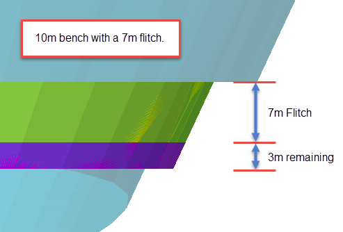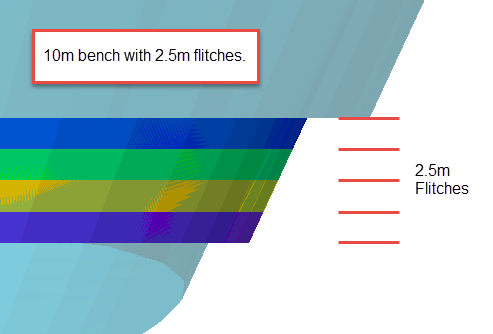Include flitches - Enabling this option allows you to set the Flitch height. The bench will be divided by the flitch height, and a separate mining solid will be created for each flitch horizon. If only one flitch can fit within the bench, then the remaining portion will be made into a mining solid.