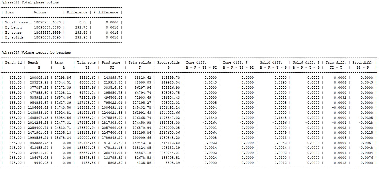After the mining solids have been created, a report will be displayed in the Vulcan Report Window similar to that shown below. The volumes of the original solids are compared to the total volume of all the mining solids into which the original solid was divided.