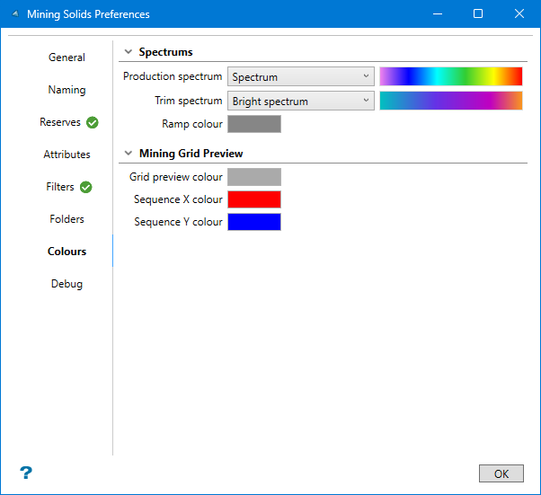 Use these options to customise the colour of the production, trim, and ramp solids. You can also customise the grid colour, and the text showing the sequence for both the X and Y directions.