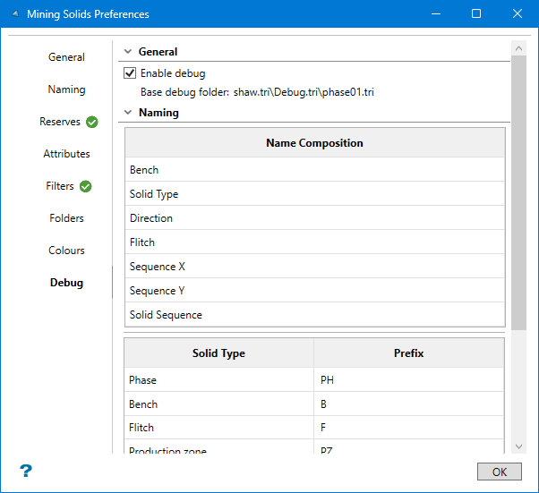Use Enable debug for advanced troubleshooting to expose incremental cutting components if necessary. This panel shows you the naming conventions used for each type of solid. If this option is enabled, then all the triangulations used to create the mining solids will be saved and stored in the Debug.tri folder.