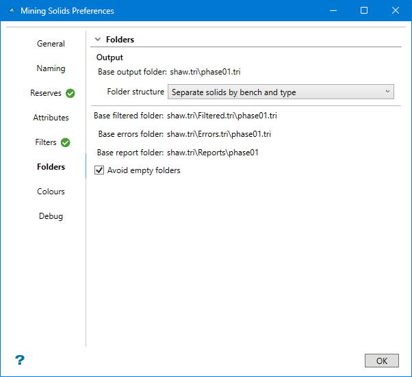 By default, the resulting mining solids are stored by bench and type, with additional folders created to hold production solids, trim solids, filtered solids, and reports. This makes it easy to work with, especially since there could be hundreds of solids created. However, you can customise the folder structure by selecting from the following options:
