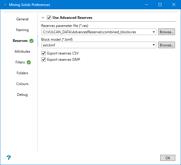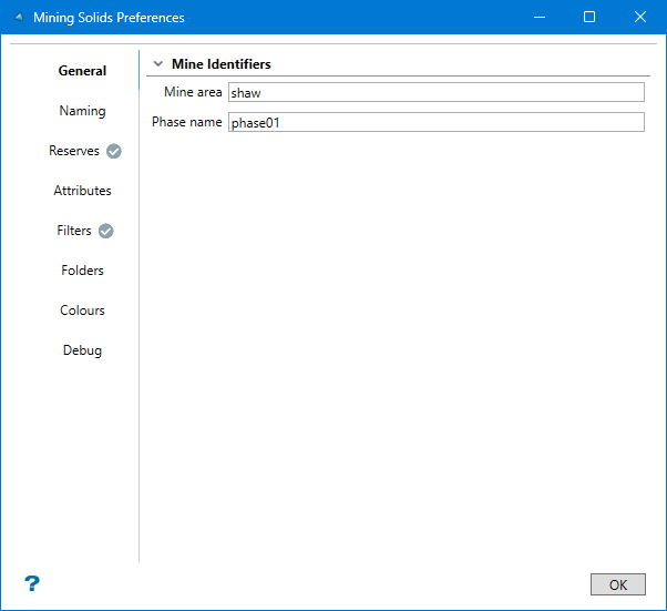 Scenario preferences (optional) - Use this to set preferences such as mine identifiers, naming schemes, reserve parameters, attributes, filters, folders, and colours. There is also a debugging option.