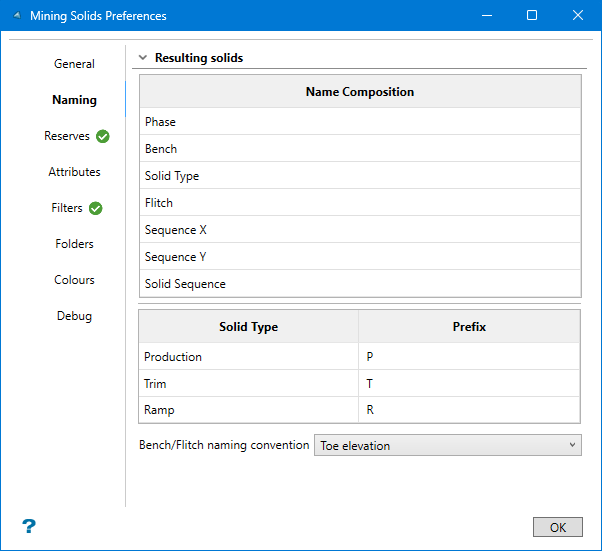 Phase phase01 Bench 160 Solid Type P Flitch F160 Sequence X X04 Sequence Y Y03 Solid Sequence 128 Bench/Flitch naming convention - Select between Crest elevation, Mid-bench elevation, or Toe elevation. This refers to where the elevation is measured from. The elevation is used in the name of each solid.