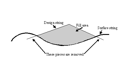 The Cut & Fill option allows cut and fill polygons to be generated between the template (refer to the Template option) and a chosen line string. The polygons are defined as being any enclosed polygon formed through the intersection of the template and the chosen line string.