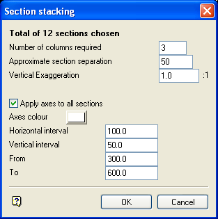 Select this checkbox to apply axes. You will need to select a colour for the axes, a horizontal and vertical interval and an upper ( To ) and lower ( From ) limit. Applying axes is a good idea, as it will produce more consistent looking rows and columns so long as the To and From values are set to a range that covers the extent of all the sections.