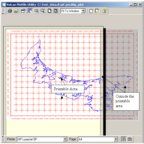 The printable area (as read from the chosen printer) displays as a white rectangle with a yellow border (representing the margins) and a black shadow. Anything appearing outside of the white rectangle (that is in the margins or not on the page) will not be printed. If you use the mouse to hover over the printable area, the cursor changes to a hand indicating that it can be moved. If you want to plot a section of the plot, then move this rectangle (by left-clicking and dragging) over the required section.