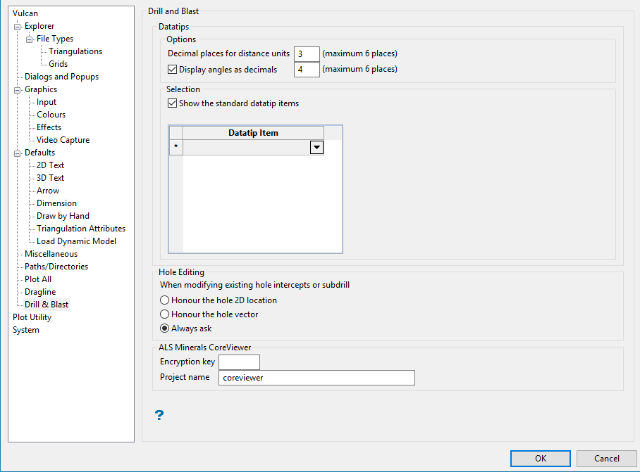 Note: The Show the standard datatip items checkbox is selected by default when Vulcan is installed for the first time.