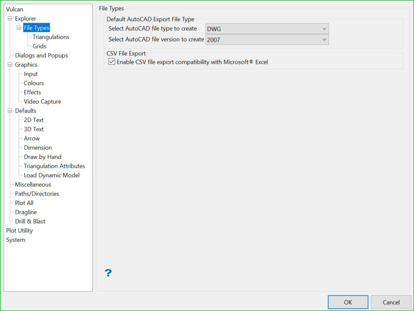 The preferences set in this section define the default entries that appear in the AutoCAD Export File Type section of the Export to AutoCAD panel. When exporting design strings/triangulations or triangulations, refer to the File > Export > AutoCAD option for more information.