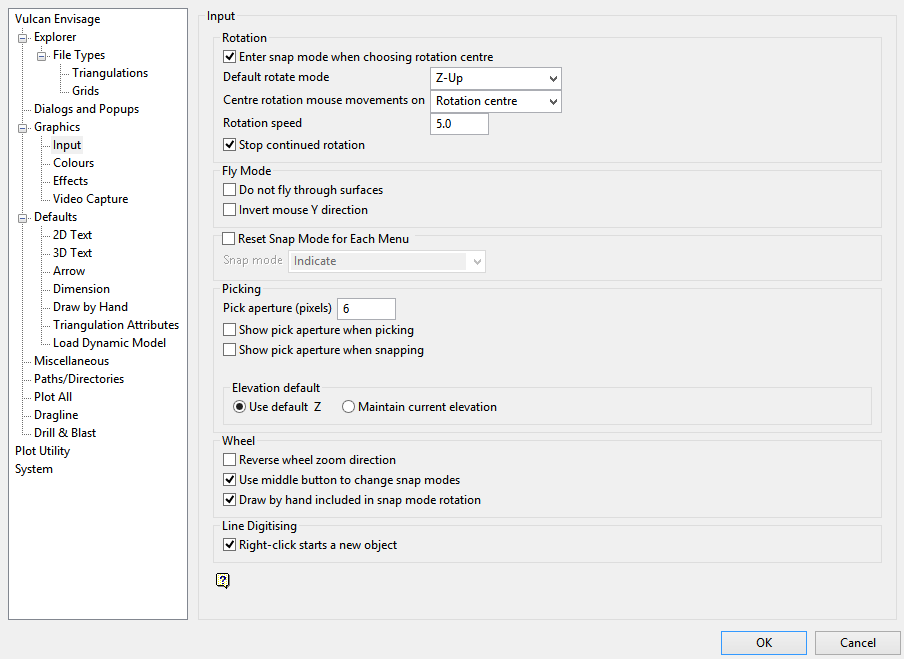 Specify how elevation values are to be treated when points are moved in a Vulcan session, that is, maintain the current Z-value or use the default elevation value. The default elevation value is specified through the Status toolbar.