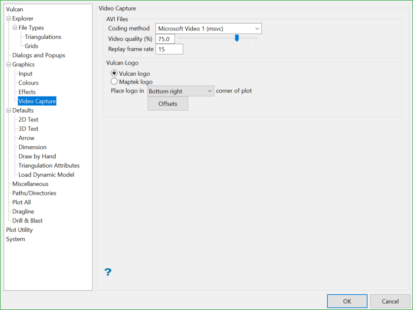 Select Vulcan logo, Maptek logo or User logo to specify the watermark to be displayed on created plots, AVIs, and screen captures taken from Vulcan.