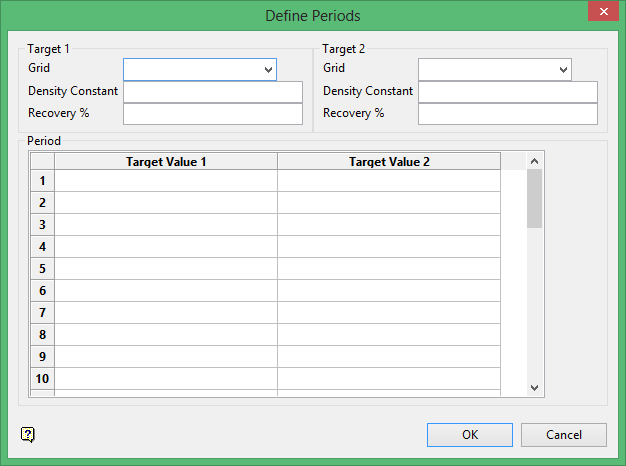 Use the Define Periods option to define target periods. You can target against any grid. While the grid is usually a thickness (coal or overburden) grid, it may also be a tonnage grid, a $'s grid, an hours grid, etc.