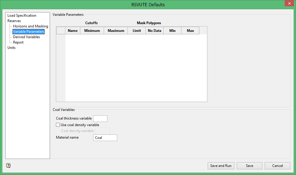 Use the Coal Variables option to specify the variable that defines the modelled coal thickness. Typically, the variable is either TK, SR or RM (mine model - run of mine thickness). This option also allows you to specify a density grid instead of a default density constant and the reported material name.
