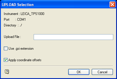 If you are creating an ASCII upload file, then the resulting upload file will use the .asc file extension. The .gsi file extension can also be is with GRE4, GIF10 and LEICA instruments. This is common for instruments that use PC cards for data storage, where an upload over the serial port is not required. PC cards are mounted as another disk drive, For example, drive O: (For example, when using an Omni drive).