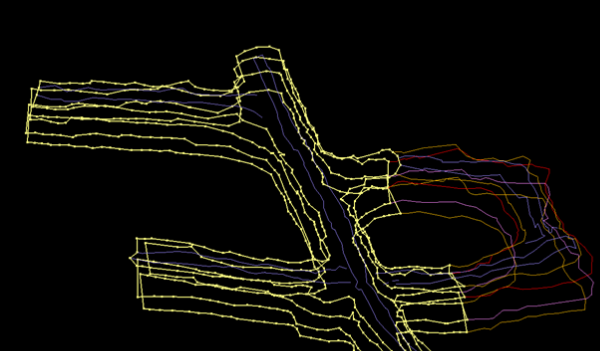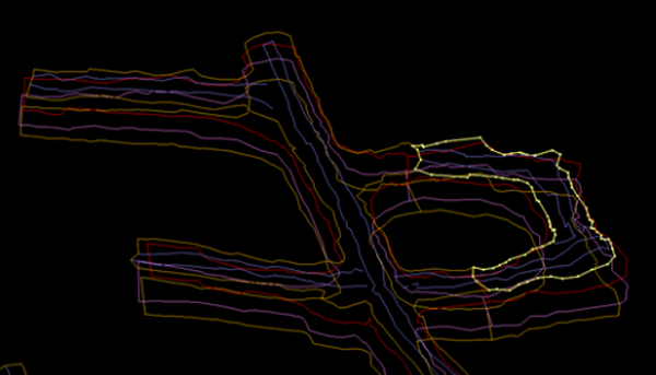 The Create Survey Triangulation function requires that an object describes a single-connected drive. For this reason, all pillar objects in a multi-connected drive must be separated into individual objects before running this function. Follow these steps to divide a multi-connected object into multiple single-connected objects for processing by the Create Survey Triangulation tool.