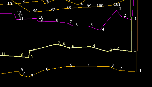 - Use Design > Point Edit > Append to append a line which connects end points up to but not including the last string in this pillar line group. The appended line for the pillar object exactly matches the line previously appended to the main drive object. Similarly, use Design > Object Edit > Join Lines to close the boundary of this object, exactly matching the boundary to the main drive object. In the example shown below, the end points of the pillar object were connected by appending a line from point 57 to 59, and then joining points 59 and 60.