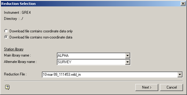 Enter, or select from the drop-down list, the name of the download file that you want to reduce. The drop-down list contains all of the download files that are applicable to the GRE4 instrument, that is, download files with the extension .wild_in or.gsi (if the instrument uses PC cards for storage).