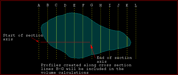Indicate the start of the 'Section axis' as shown in the diagram below. All profiles that the Section axis intersects are included in the volume calculations.