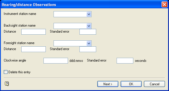 Once all fixed stations have been entered, select OK. Once selected, the following panel displays. This panel will allow you to enter the angle and distance observations.