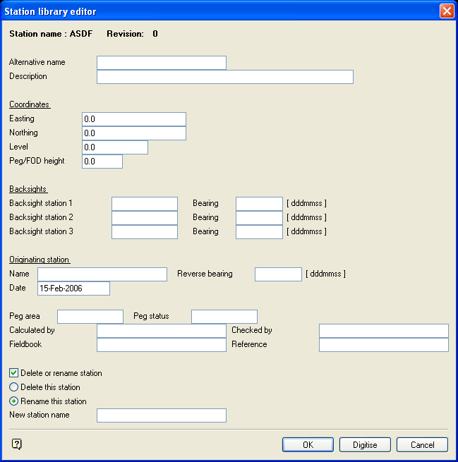 The station's coordinates can be manually entered or you can use the Digitise button. The Digitise button allows you to use Indicate or any of the other Design Entry modes to digitise the coordinates which will then automatically be inserted.