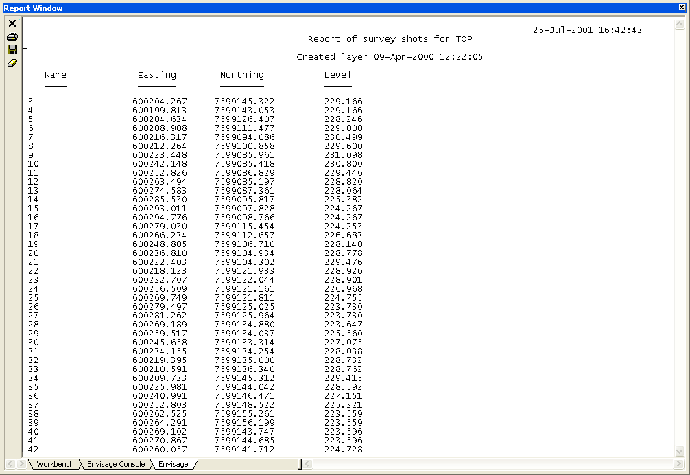 The list can be printed, and is automatically saved as <layer name>.00_list. This is a useful feature, which to get quickly a file listing of the coordinates of an object. Only the X, Y, Z coordinates and point names are given.