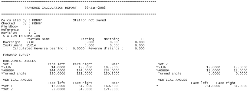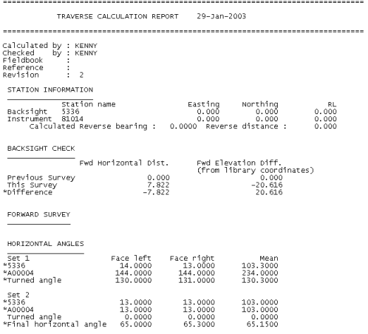The Traverse Station Validation Report (see Diagram 4) displays. The details are displayed for ease of verifying. The calculations that have failed the traverse validation criteria are flagged with an asterisk (*) in the first column of the report. If any errors need to be corrected, then use the Back button to go back to previous data entry panels.