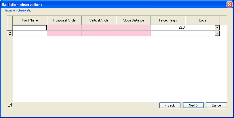 Specify the first target height (this height is mandatory). The default is the height used for the traverse. Subsequent target heights need only be specified if the height changes. Blank target heights assume that the height has not changed.