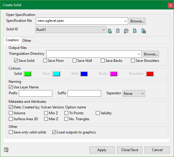 A start-name is always added into the final filename for all triangulations. When creating the Save Solid triangulation, the literal “solid” is added at the start of the filename. Similarly when creating the Save Floor triangulations, the literal “floor” will be added and this naming scheme will be applied to the rest of the triangulations.