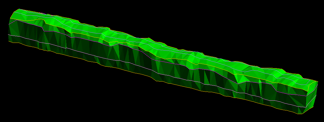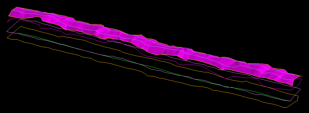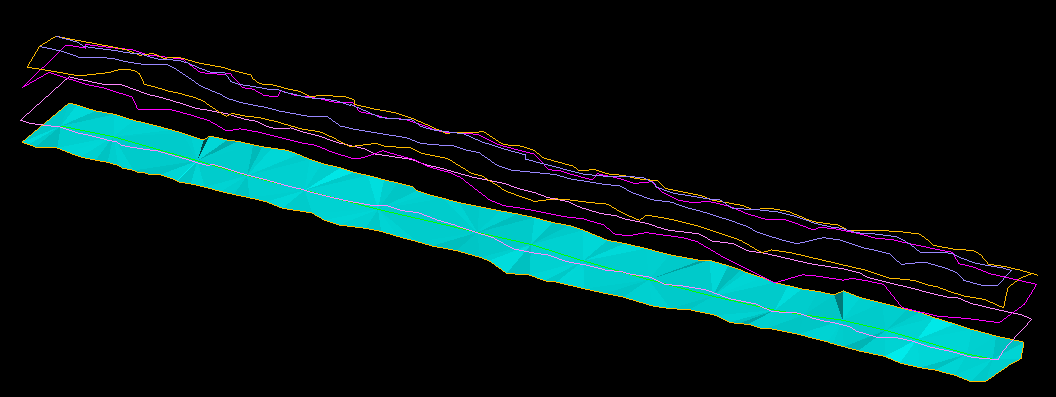 The Create Solid option allows to create triangulations (both solids and surfaces) that cover and adhere to the underground survey scans passed in as input. The underground scans need to be placed in a single layer in a design database. They comprise open and closed polylines that define the floor, wall, backs, and shoulders of the underground mine tunnels. They also have optional attribute and property information like group names that define which part (floor, wall, backs, etc.) of the underground mine they belong to and determine what the final triangulation solid/surface shape looks like.