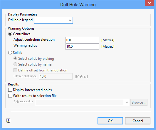 Select this option to check for drillhole locations that intercept nominated solid triangulations. Choose Select solids by picking to select triangulations directly from the screen. In order to do this, the desired triangulations must be loaded onto the screen prior to running the Drill Hole Warning option.