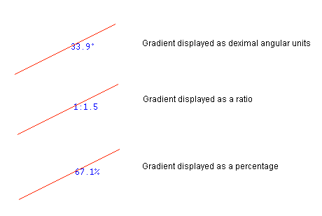 The format used when displaying the gradient value is controlled through the Label format drop-down list. The gradient can be displayed as decimal angular units (nnn.n), as a normal grade specification (1:nnn) or as a percentage grade (nnn.n%). The resulting label can contain up to 6 decimal places. The default numbers of decimal places is derived from the Miscellaneous section of the Tools > Preferences option.