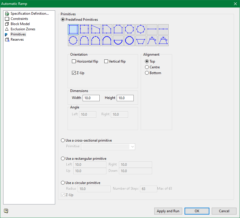 Use this section allows to select primitives to be used with the ramp centreline. By using primitives the line can be converted to a volume that can be evaluated. The volume will be used for reserves as well as to evaluate the criteria when using a block model variable.
