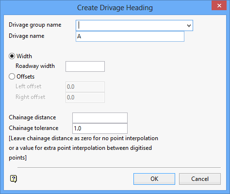 Select this option if you want to create drivage headings as centre lines of the roadway. If this option is selected, then you will need to specify the width of the roadway.