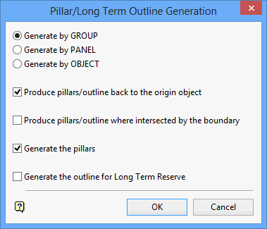 On the Underground menu, point to Coal Development, and then click Pillars/LT Outlines to display the Pillar/Long Term Outline Generation panel.