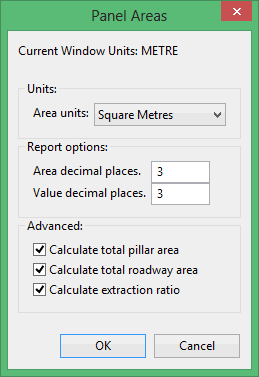 Select the additional area option to report on. If no option is selected here, the report window will only display the areas of the individual roadway polygons and not the totals. Pillar area is equal to the panel area minus the area of the roadway block polygons. Roadway area is the total of the roadway polygon areas. Extraction ratio is roadway area divided by the total panel area. The panel area is the roadway area plus the pillar area.