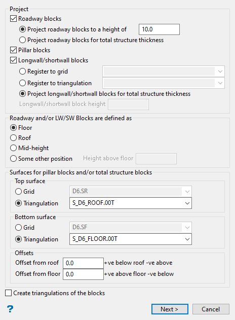 Define the two surfaces to project between (for pillar and roadway blocks - total seam thickness) in the section labelled Surfaces for pillar blocks and/or total structure blocks. The block projection is based on the surfaces and the offsets between the blocks and the surfaces.