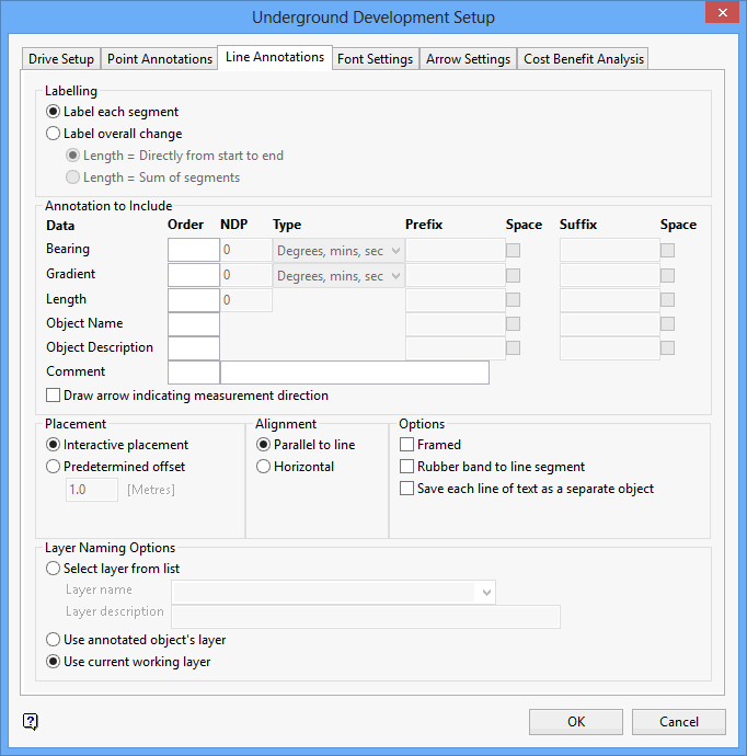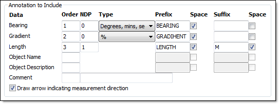 Use the Lines Annotations tab to specify the annotation method for lines, as well as the layer in which to store the annotations. Lines can be annotated with length, bearing, gradient, object name and description, and a comment. These specifications will be used by the Line(s) Annotation option.