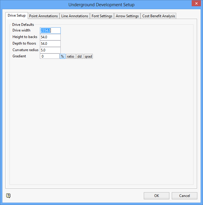 Enter the drive width, height to back, depth to floors, curvature radius and gradient values. These are the default measurements that appear in later Development panels. The unit of measurement for the drive width, height and curvature radius is set in the .dg1 file.
