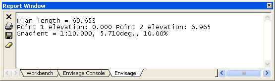 The elevation of the points, and gradient between them, is then displayed in Report Window. The gradient displays as a ratio, angle of inclination (degrees) and as a percentage. The gradient is reported as positive or negative depending on the line of direction.