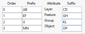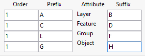 The triangulations can be named with various combinations of layer, feature and group. The order determines if the attribute is going to be incorporated into the name or ignored. Orders of less than or equal to zero are ignored, where as a value greater than one will be included.