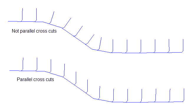 Select Create parallel cross cuts if you want to create cross cuts that are parallel to one another regardless of any changes to the centreline. The size of the angle between the first cross cut and the centreline is the value entered in the Angle Between Cross cut and centreline field. The remaining cross cuts are parallel to the first cross cut.