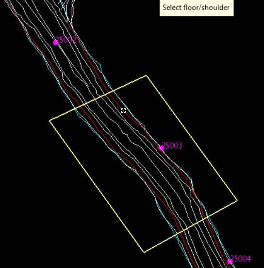 Once the floor or shoulder string has been selected the user will be prompted to digitse the first back point (i.e. the furthest point backwards from the survey station) on the selected floor/shoulder string, followed by the first forward point (i.e. the furthest point forwards from the survey station) on the same side of the selected string as the first back point.