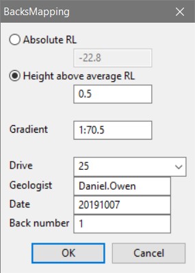 Creates a mapping template from survey pickup strings and creates a section view to allow the plan-view mapping of underground geological information in the backs (roof of the drive). Also creates incremented measurements away from a given reference point.
