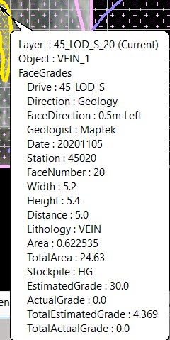 Allows the quick and automatic calculation of the area weighted grade of the face based on the polygon areas and estimated grades of each lithology (rock type), as well as assigning the stockpile and face direction attributes.