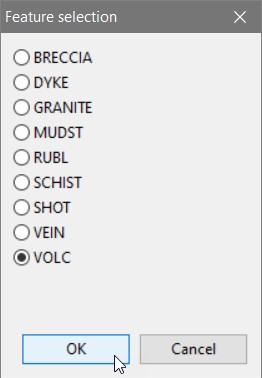 Select the feature (lithology code) to digitise then digitise the line as desired. When finished, right-click to finish digitising that object. The Feature selection panel will be persistent until Cancel is selected.
