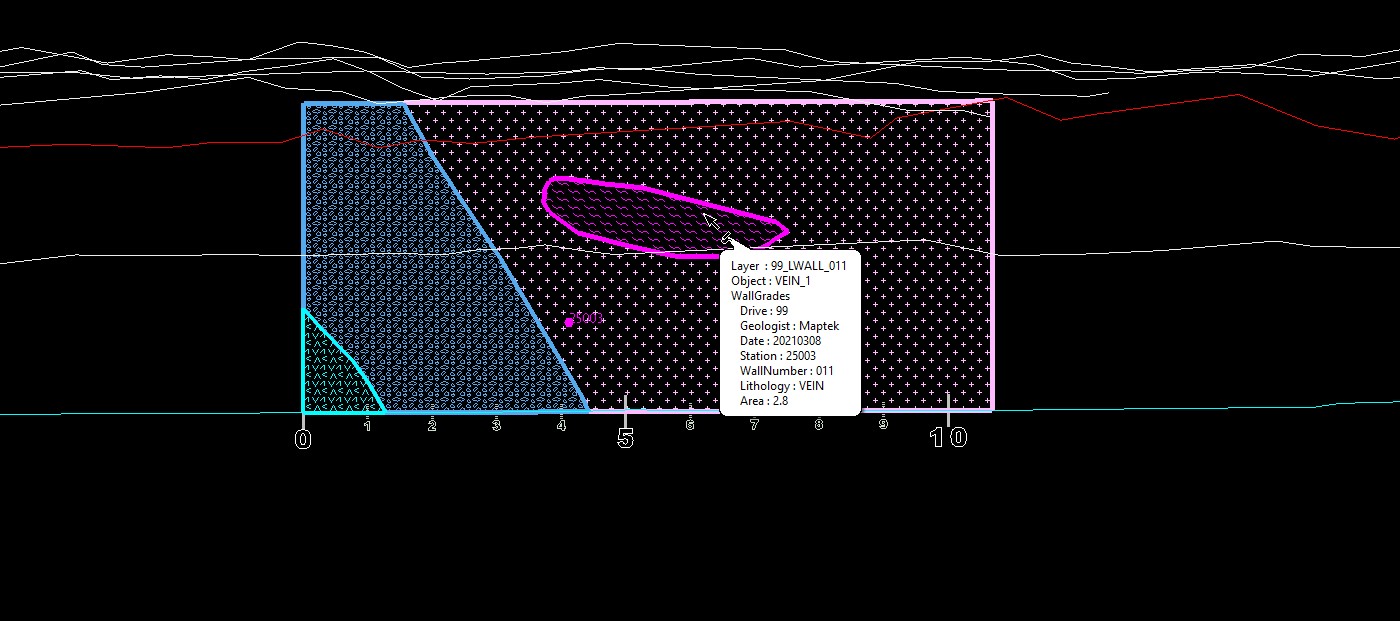 Creates a Section view to allow the cross section-view mapping of underground geological information in the walls of the drive. It also creates incremented measurements away from a given reference point.